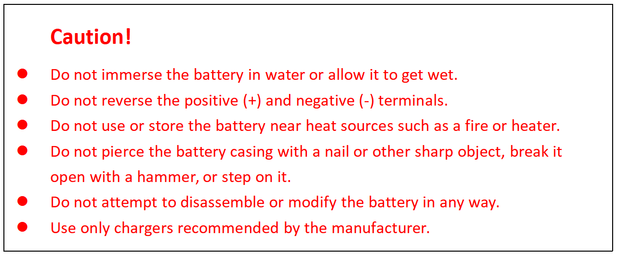 • Do not disassemble, crush, puncture, short-circuit, or expose to high temperatures.