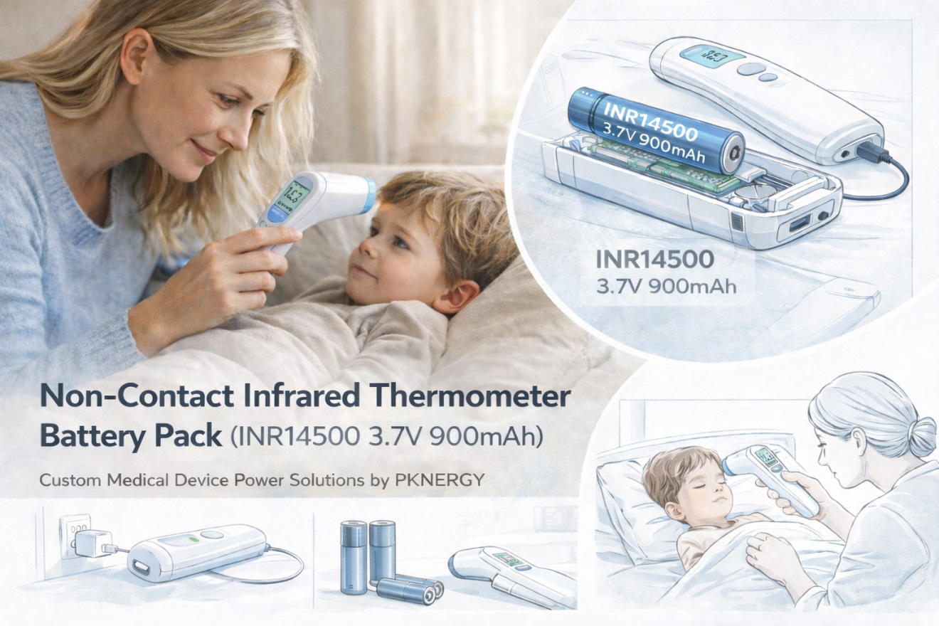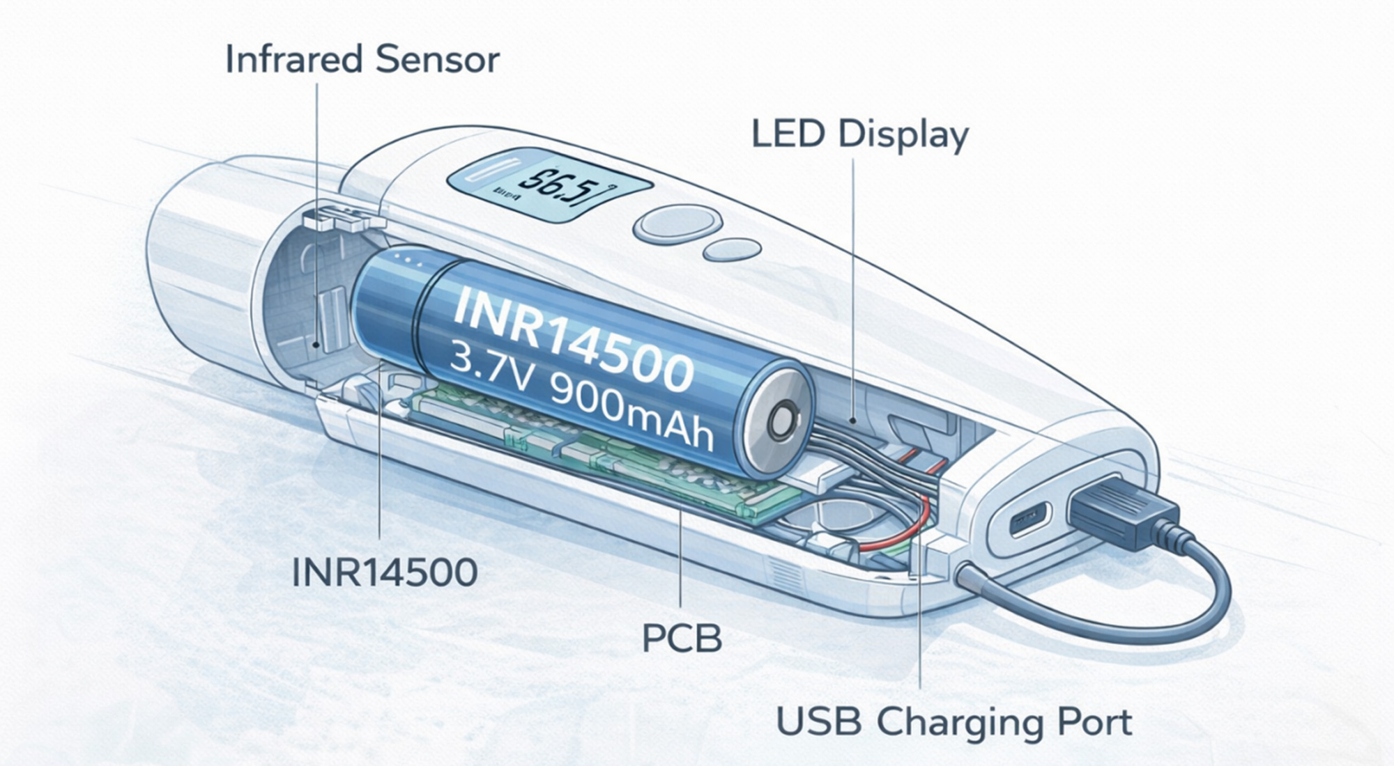 A handheld IR thermometer requires fast power-up for sensor and display initialization, while also maintaining charge during standby. PKNERGY provides a drop-in rechargeable 14500 solution designed for stable output, safer discharge behavior, and plug-and-play electrical compatibility.