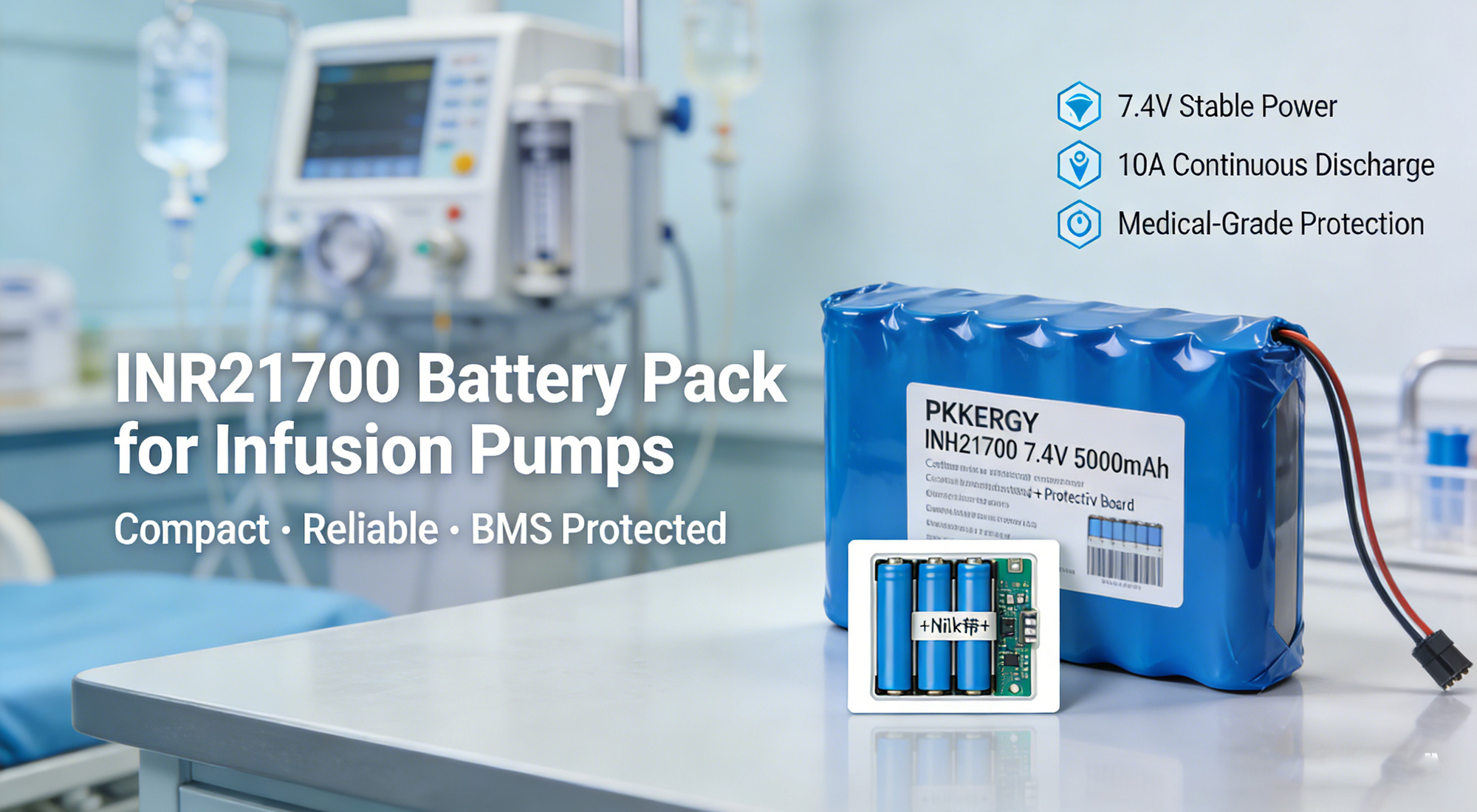 INR21700 7.4V 5000mAh Battery Pack for Medical Infusion PumpsCompact, stable, and BMS-protected power designed for portable infusion devices—supporting longer runtime, reliable dosing accuracy, and safer operation in hospital and home-care environments.