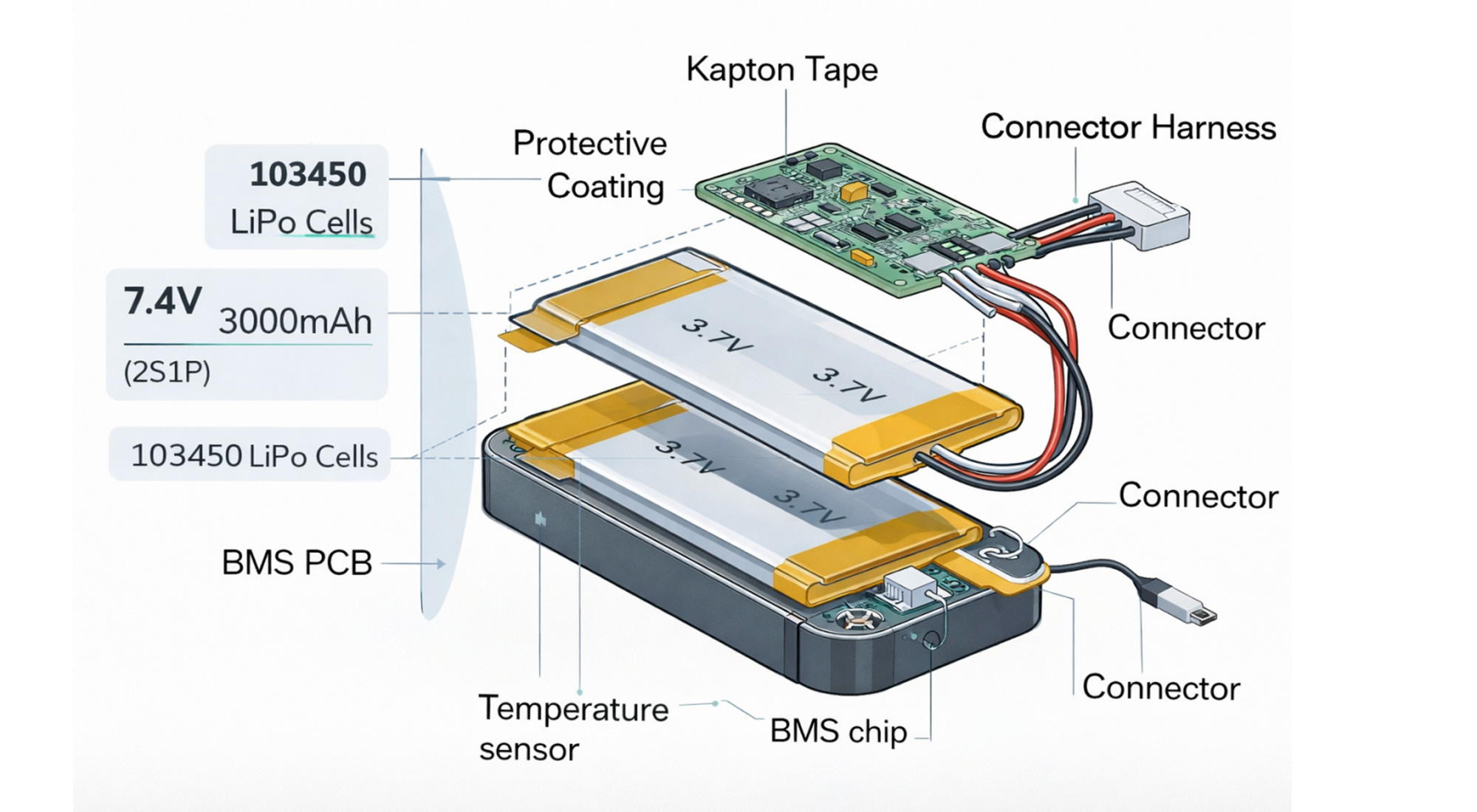 Ultra-slim LiPo cells, micro connector, soft-pack configuration.