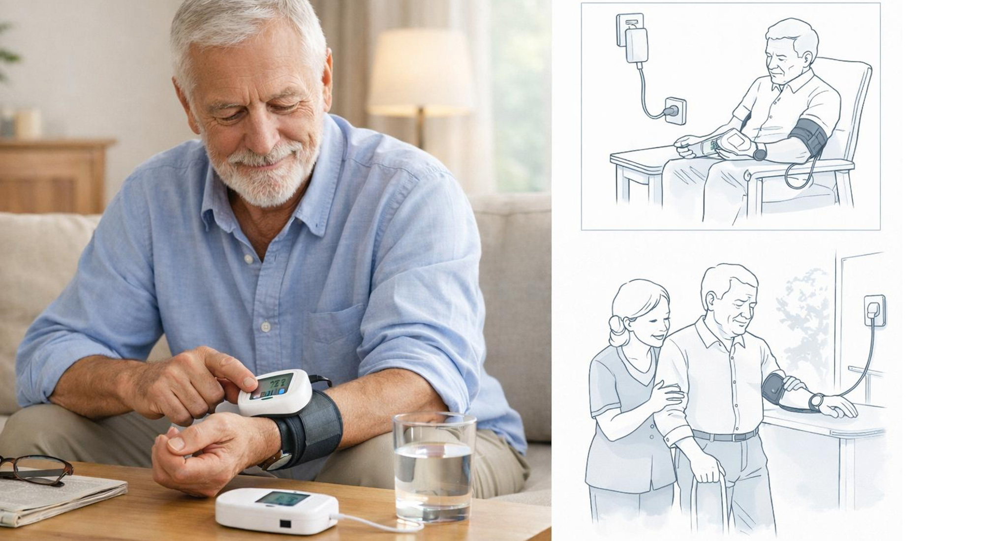 Suggested hero image: wrist BP monitor in homecare / outpatient scene.
